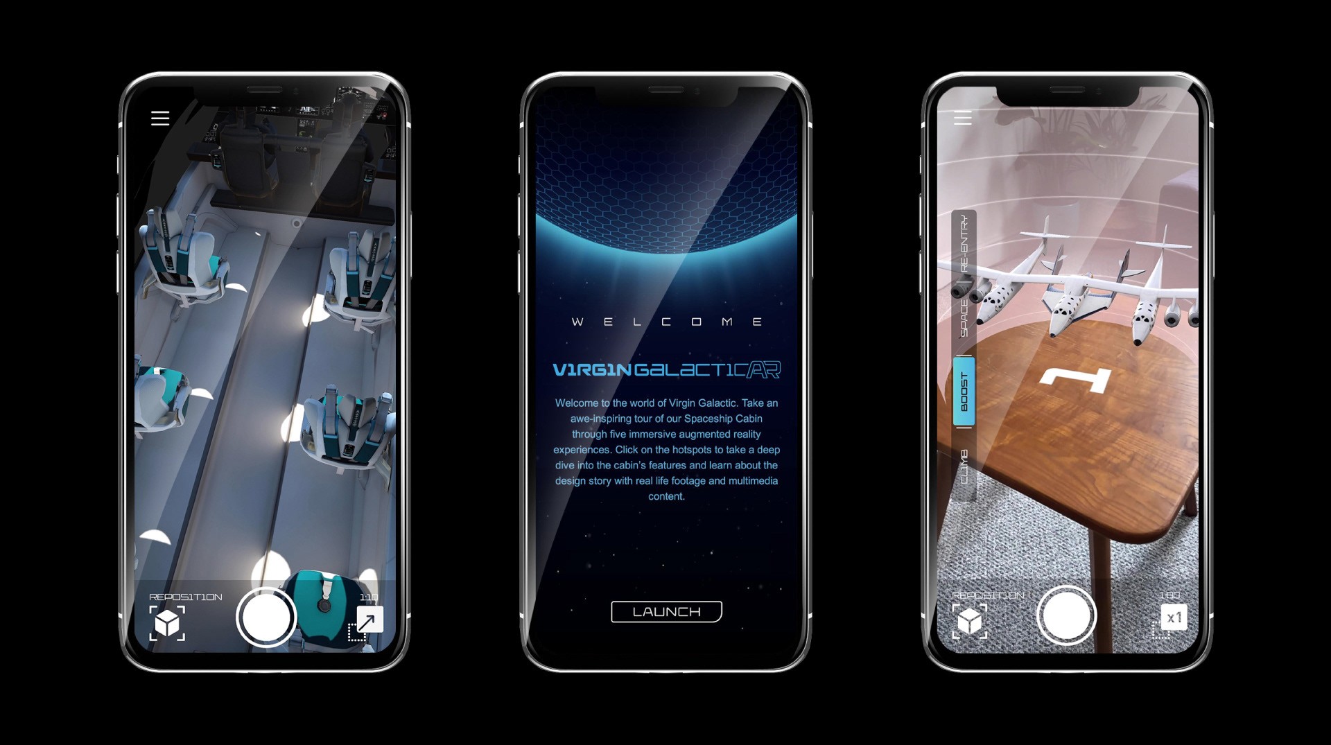 Seymour Powell brought me on to help design the Virgin Galactic spaceship. We created both a VR and an AR mobile experience to showcase the ship's interior and the overall flight experience. I worked on building the VR experience, modeling the ship, creating camera animations, rendering, and more.
